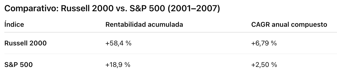 Y desde esos niveles de 2001, podemos ver como por el ejemplo el Russell 2000 (indice de EEUU de empresas pequeñas) superó con creces el SP500 durante los 6 años posteriores: