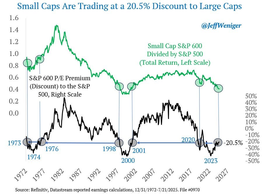 La opinión del analista de Morgan Stantenly se basa en innumerables datos que muestran como actualmente los indices de pequeñas empresas (smalls caps) están mínimos históricos de valoración y las diferencia con sus hermanas mayores, (las grandes empresas) está en niveles vistos solo en 2000 o 1975.