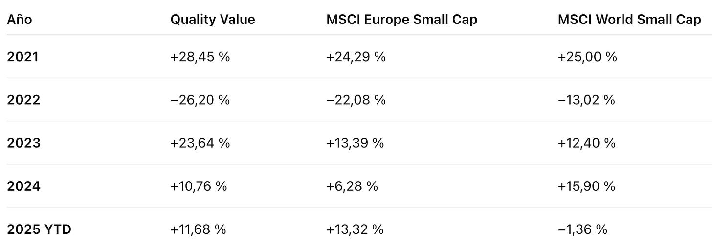 Mi filosofía de inversión se centra en pequeñas empresas de calidad, por eso mis indices comparables son el MSCI Europe Small-Cap y el MSCI World Small Cap.