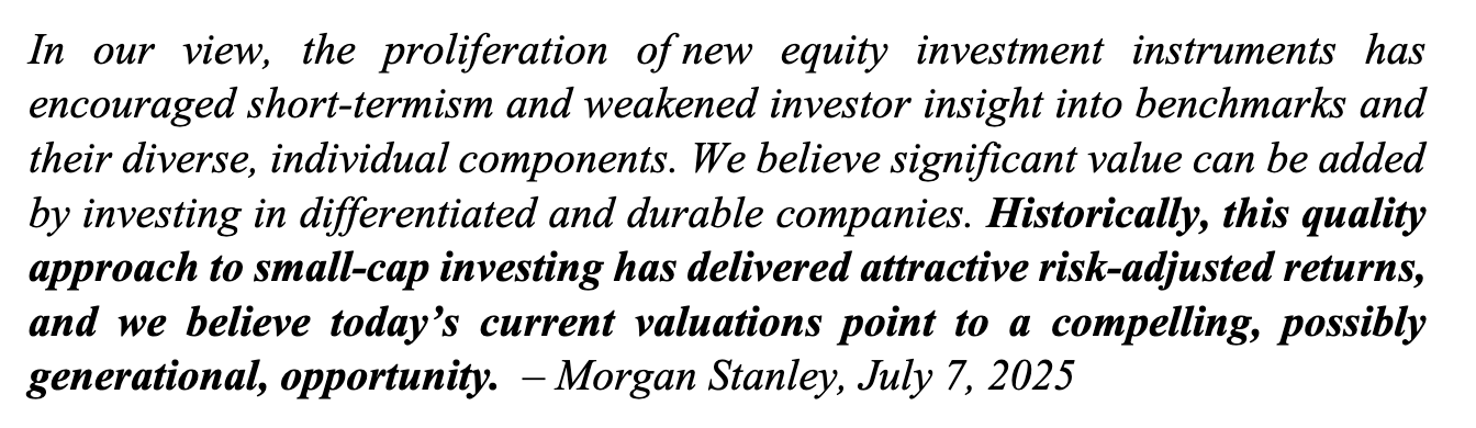 “En nuestra opinión, la proliferación de nuevos instrumentos de inversión en renta variable ha fomentado el cortoplacismo y ha debilitado la capacidad de los inversores para analizar los índices y sus diversos componentes individuales. Creemos que se puede generar un valor significativo invirtiendo en compañías diferenciadas y duraderas. Históricamente, este enfoque de calidad en la inversión en small caps ha ofrecido atractivos retornos ajustados al riesgo, y consideramos que las valoraciones actuales apuntan a una oportunidad convincente, posiblemente generacional. – Morgan Stanley, 7 de julio de 2025”