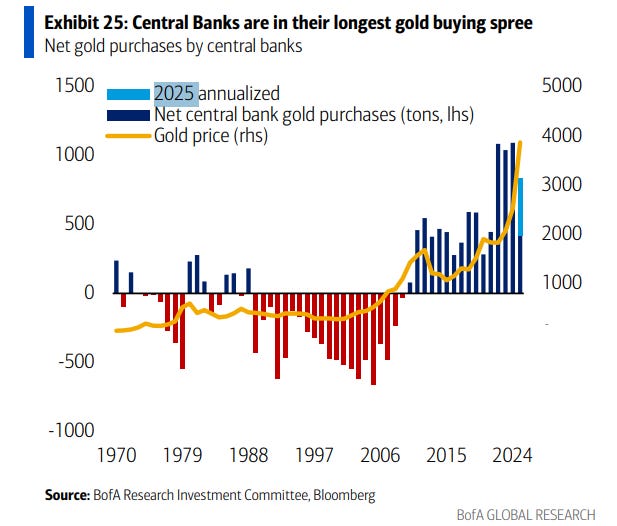 El gráfico muestra que los bancos centrales están en su mayor y más prolongada ola de compras de oro desde 1970. Desde 2010 acumulan compras netas récord, coincidiendo con una fuerte subida del precio del oro, que supera los 4.000 $/oz en 2025 anualizado.