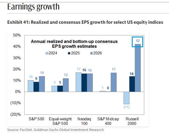 El Russell 2000 destaca por un giro brusco en beneficios: –11% en 2024 y un +42% esperado en 2025 (con +14% en 2026), muy por encima del S&P 500, Nasdaq o Midcap. Esto sugiere una fuerte recuperación de EPS en las small caps y refuerza la tesis de rebote del segmento.