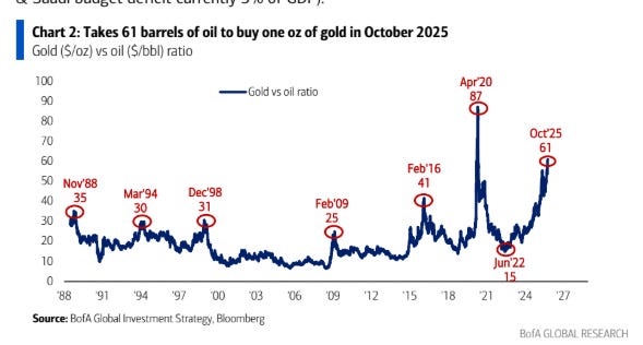 El gráfico muestra cuántos barriles de petróleo se necesitan para comprar una onza de oro. En octubre de 2025 hacen falta 61 barriles, un nivel muy alto que indica que el oro está caro en relación con el petróleo.