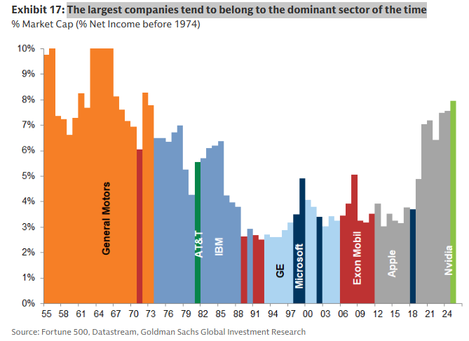 El gráfico muestra que las empresas más grandes de cada época suelen pertenecer al sector dominante de su tiempo. En los años 60 lideraba General Motors (industria), en los 80 IBM y AT&T (tecnología y telecom), en los 2000 Microsoft y ExxonMobil, y hoy Apple y Nvidia, reflejando cómo el liderazgo económico cambia con los ciclos tecnológicos y sectoriales.