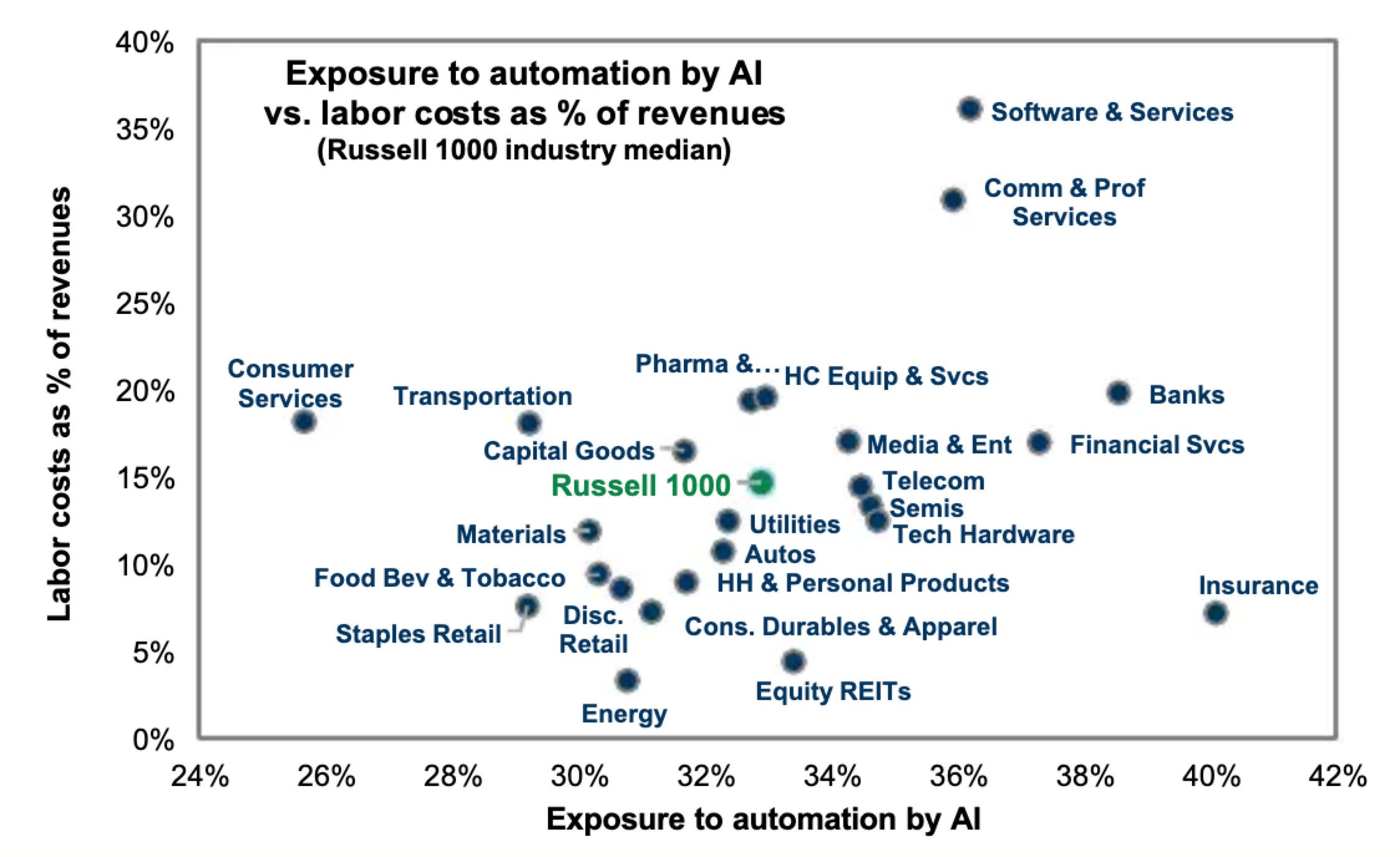 Sectores con alta exposición a automatización y alta intensidad laboral (Software & Services, Consulting/Professional Services, parte de Financieras/Banca) son los más susceptibles a disrupción y expansión de márgenes vía IA. En el extremo opuesto, Energía, REITs, consumo estable/retail básico muestran baja exposición y/o menor peso laboral, por lo que el impacto directo de la IA sería más limitado.