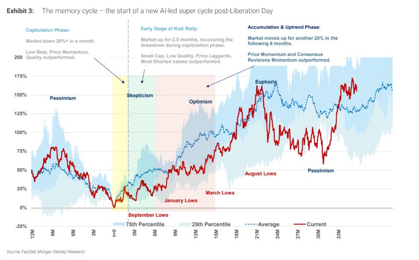 El gráfico describe el “memory cycle” tras una capitulación: pesimismo → rally de escepticismo → fase de acumulación y tendencia alcista, donde lideran momentum y revisiones al alza. La lectura implícita: el mercado estaría en la fase de acumulación/uptrend post-IA; correcciones son probables pero, históricamente, han sido oportunidades dentro de una senda ascendente.