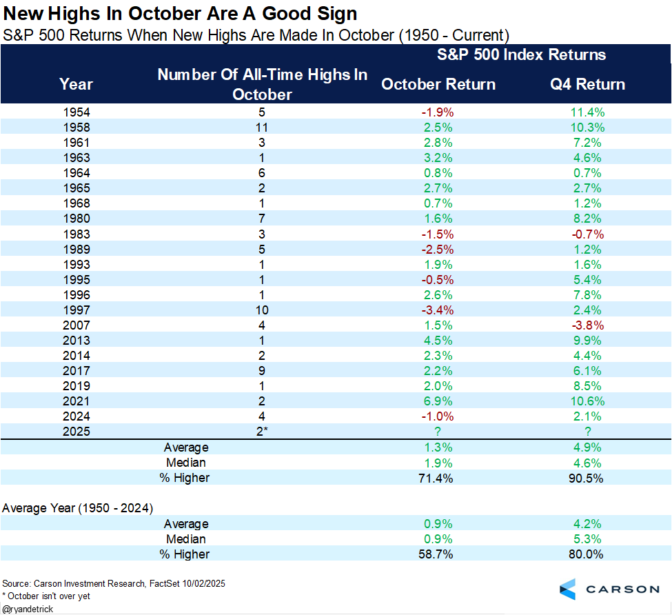 Cuando el S&P 500 marca máximos históricos en octubre, el trimestre suele ser fuerte: media +4,9% en Q4 y 9 de cada 10 años al alza (vs. +4,2% y 80% en un año promedio). Conclusión: los nuevos máximos en octubre son una señal positiva de continuidad alcista hacia fin de año.