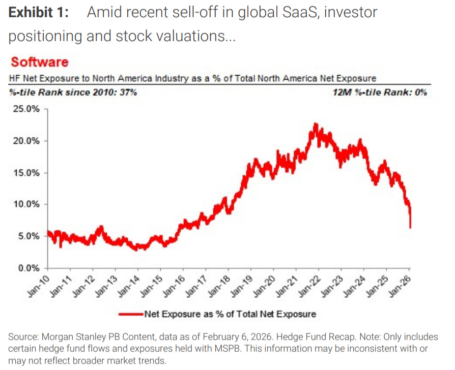 Qué mide y contexto: Exposición neta de hedge funds a software en Norteamérica (como % de su exposición total) desde 2010; importa porque refleja el “apetito” institucional por el sector.