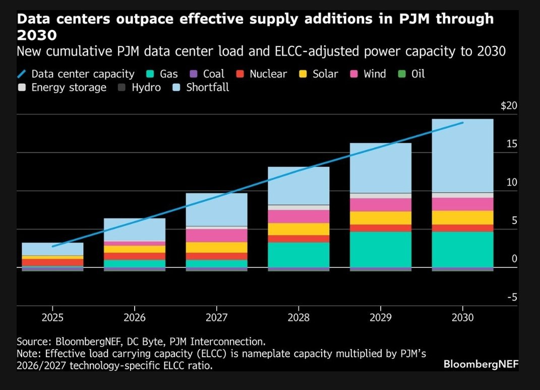 Qué mide y contexto: Demanda eléctrica de data centers vs nueva capacidad “útil” en PJM hasta 2030; importa porque marca si habrá energía suficiente.