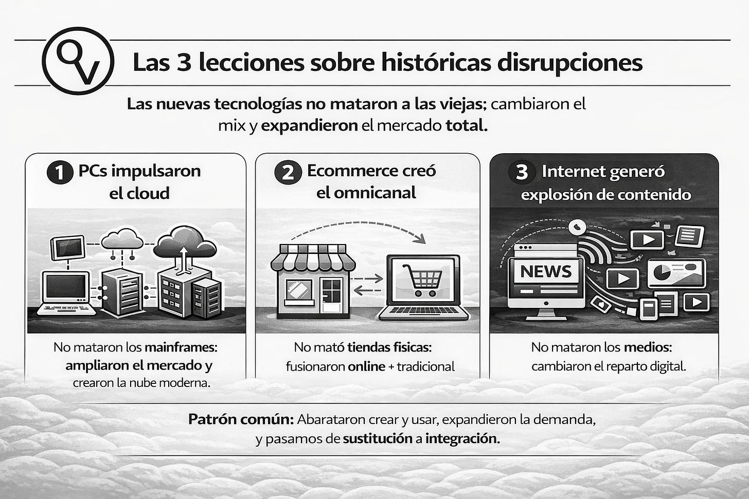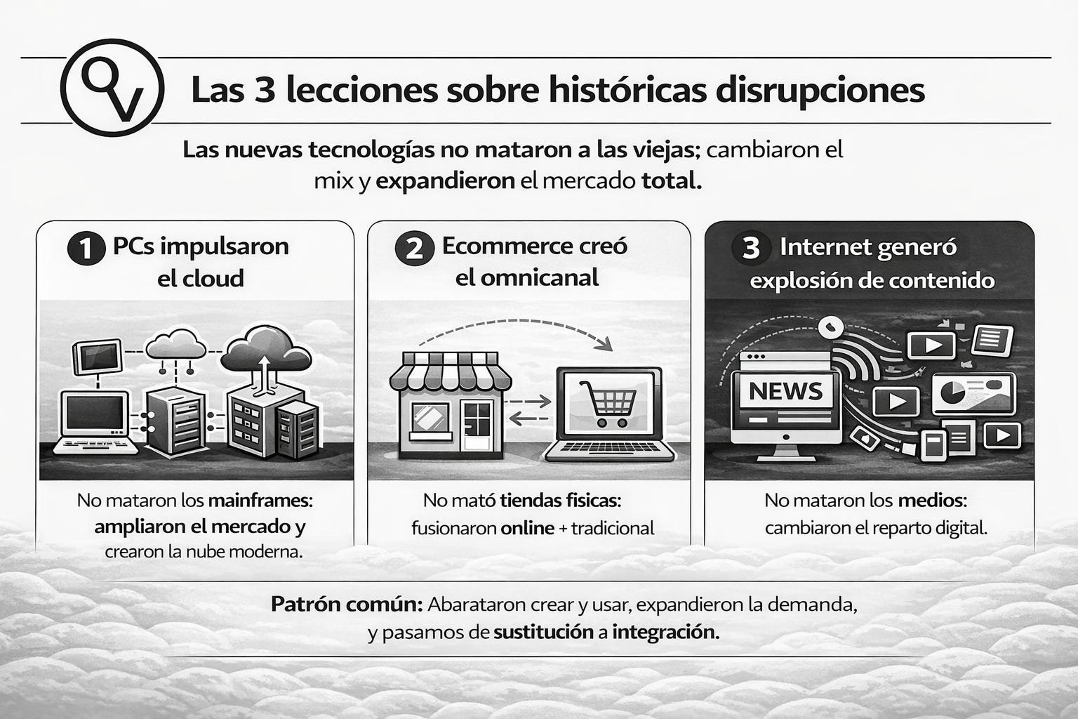 La nueva tecnología abarata crear y usar, eso expande la demanda total, y el mercado suele pasar del marco mental de “sustitución” al de “integración”. En el proceso, sufren los players débiles y ganan los que se adaptan —y los nuevos líderes.