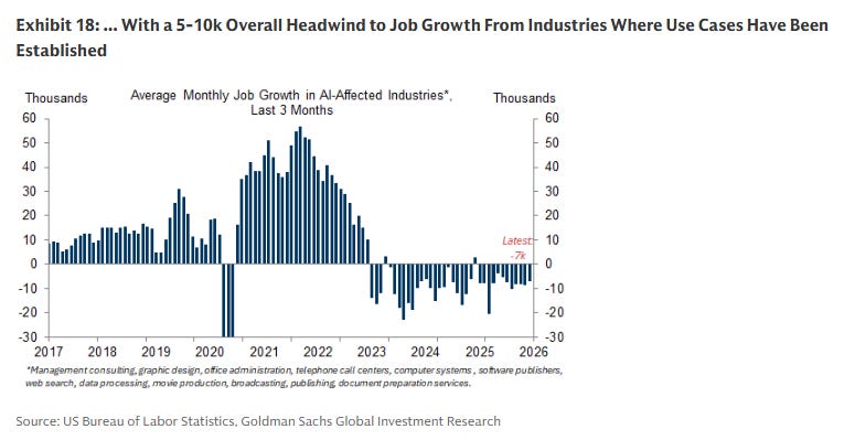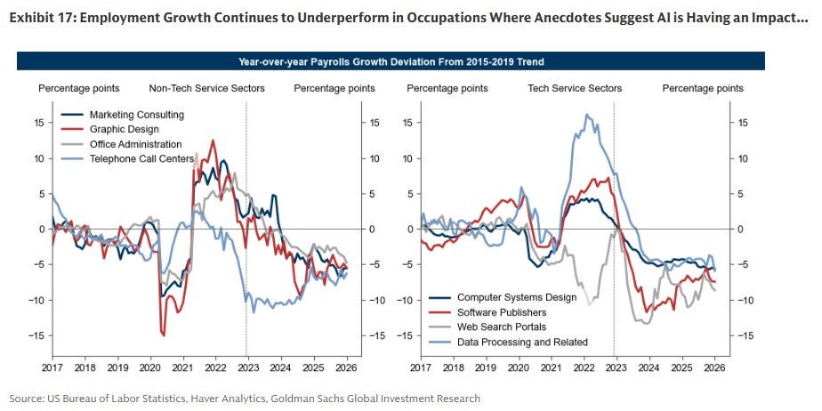 Qué mide y contexto: Crecimiento de nóminas (empleo, no salarios) YoY vs. tendencia 2015-19 en sectores con alta exposición a IA; mide si estas industrias están contratando más lento de lo normal.