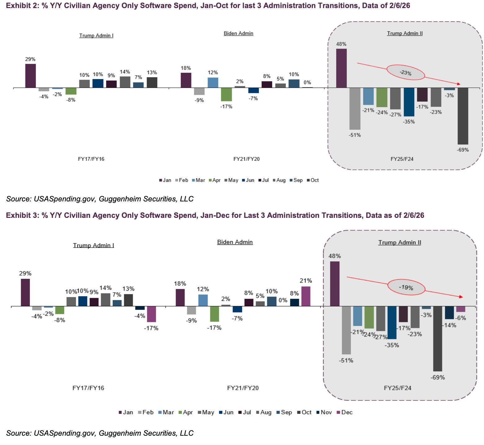 Qué mide y contexto: Variación YoY del gasto federal en software civil en primeros meses de cada administración; proxy de demanda para vendors como Microsoft, Oracle, Salesforce.