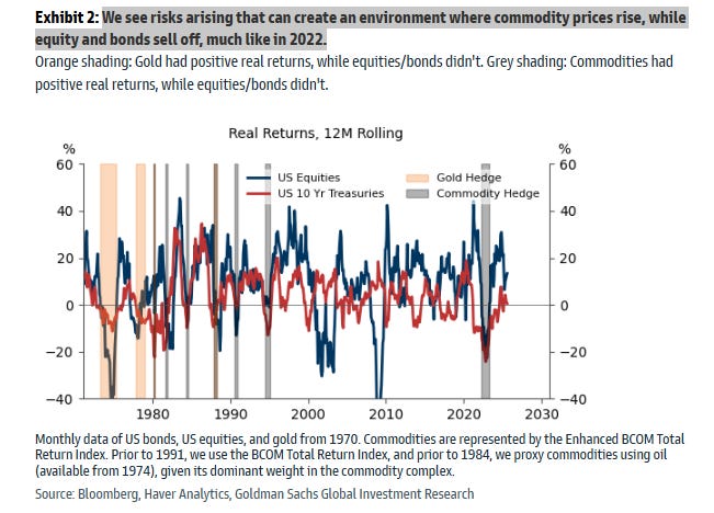 - El gráfico muestra que en ciertos periodos —como en 2022— las materias primas obtienen rentabilidades reales positivas mientras que acciones y bonos caen. Esto sugiere que los commodities actúan como cobertura en entornos inflacionarios, cuando los activos tradicionales sufren.