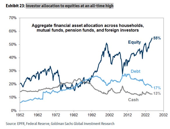 - El gráfico muestra que la asignación de activos de los inversores a renta variable (55%) está en un máximo histórico, mientras que la exposición a deuda (17%) y efectivo (13%) se mantiene en mínimos relativos.