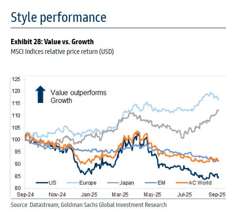- El gráfico compara el rendimiento relativo de Value vs. Growth en diferentes regiones (EE.UU., Europa, Japón, emergentes y global). Se observa que, desde finales de 2024 hasta septiembre de 2025, las estrategias Growth han superado claramente a Value, sobre todo en EE.UU. y mercados globales.