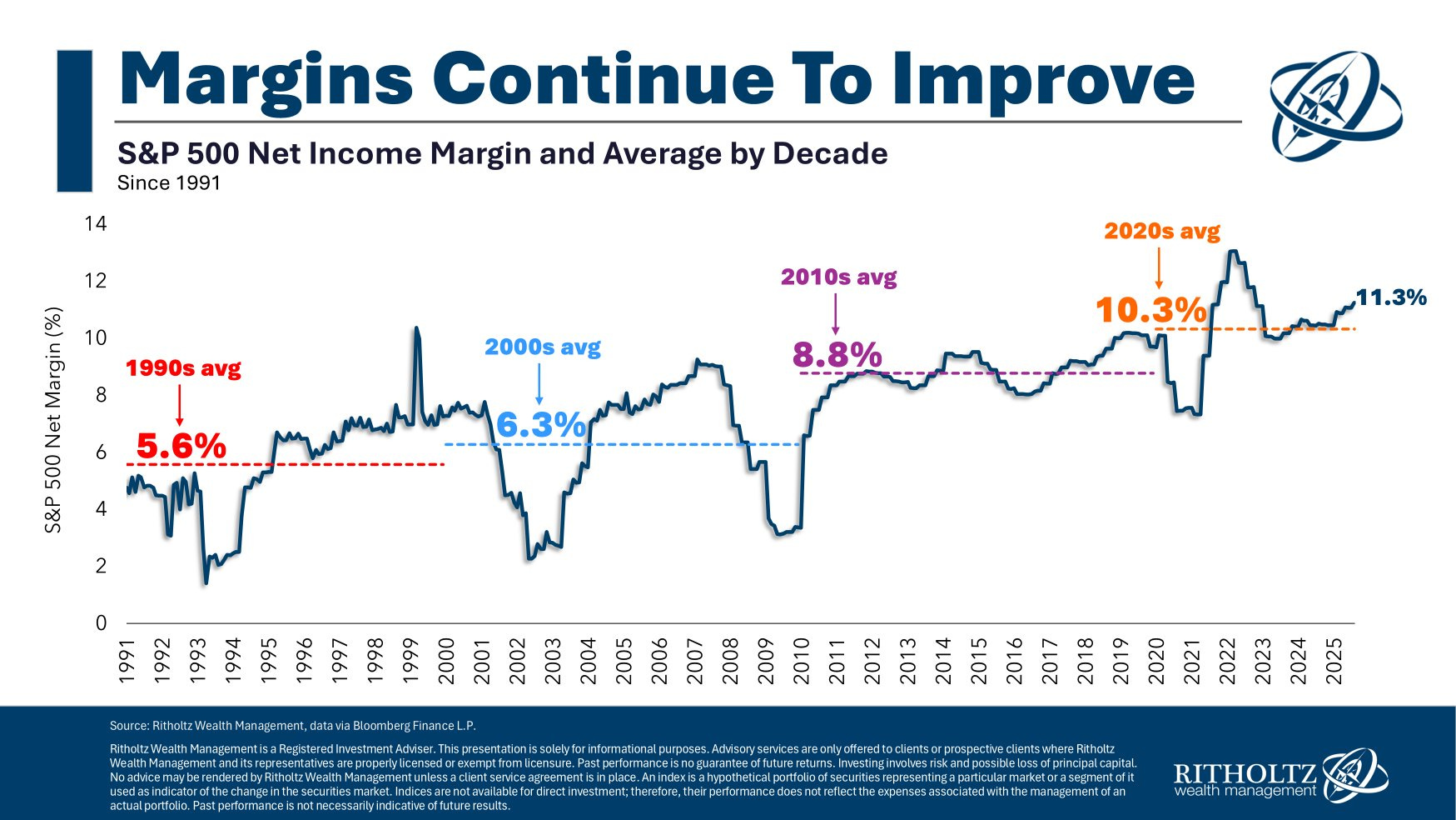 - Los márgenes netos del S&P 500 han crecido de forma constante, pasando del 5,6% en los 90s al 10,3% en los 2020s. Actualmente se sitúan en un máximo del 11,3%, reflejando la mayor rentabilidad histórica de las empresas.