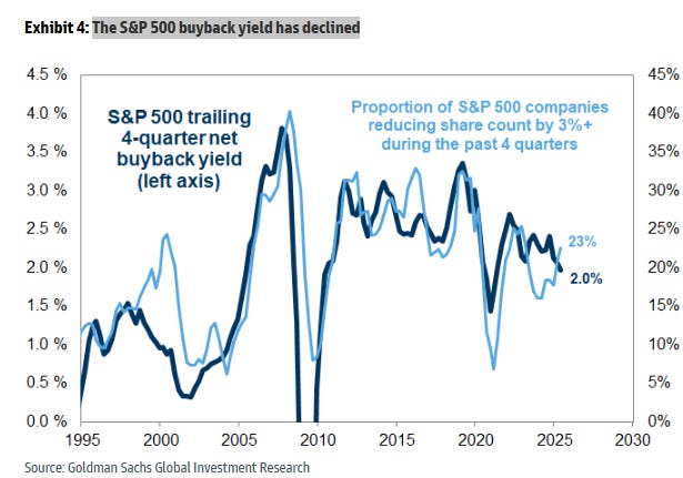 - El gráfico muestra que el rendimiento por recompras de acciones en el S&P 500 ha caído hasta el 2%, mientras que solo un 23% de empresas reducen su número de acciones en más de un 3%, ambos en mínimos respecto a años anteriores.