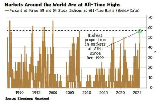 El gráfico muestra el porcentaje de grandes índices bursátiles mundiales (desarrollados y emergentes) que están en máximos históricos, hoy cercano al 60%. Es la proporción más alta desde diciembre de 1999, lo que indica un rally muy amplio y unos mercados globales en un punto de fuerte euforia.