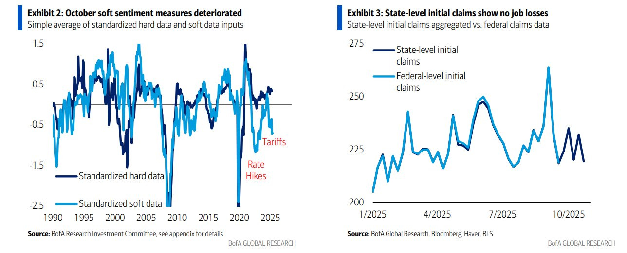 El gráfico de la izquierda muestra que en octubre los indicadores “blandos” (encuestas y sentimiento) se han deteriorado claramente por debajo de cero, mientras que los datos “duros” de actividad real siguen cerca de la media histórica.