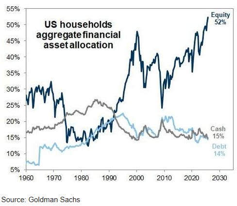 El gráfico muestra cómo las familias estadounidenses tienen hoy alrededor del 52% de sus activos financieros en bolsa, niveles históricamente muy altos, mientras que la parte en efectivo (15%) y deuda (14%) está relativamente baja.