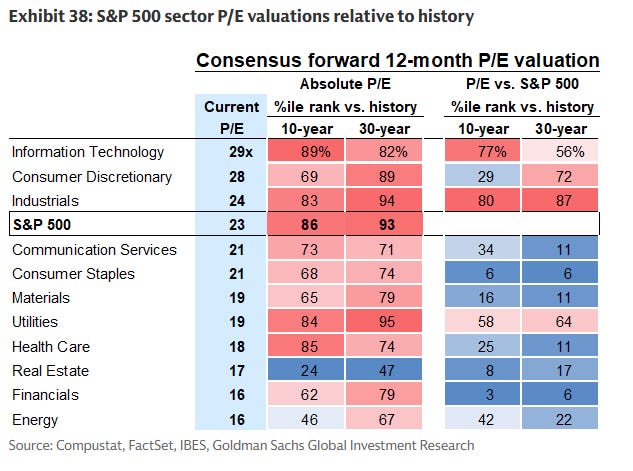 PER adelantado a 12 meses de cada sector del S&P 500 y en qué percentil se sitúa frente a su propia historia de 10 y 30 años. Tecnología, Industriales o Utilities están caros frente a su media histórica y al índice, mientras que sectores como Energía, Financieras o Real Estate cotizan más cerca de sus valoraciones históricas bajas.