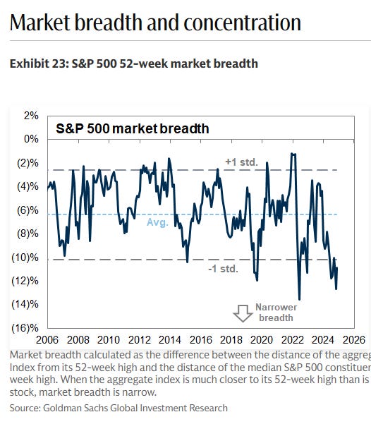 El gráfico muestra la “amplitud” del S&P 500, es decir, cuánto difiere la distancia del índice a su máximo de 52 semanas frente a la distancia media de cada acción a su propio máximo. Al estar hoy muy por debajo de la media histórica (más de -1 desviación estándar), indica que el mercado tiene una amplitud muy estrecha: pocas acciones grandes están tirando del índice mientras la mayoría está bastante más lejos de máximos.