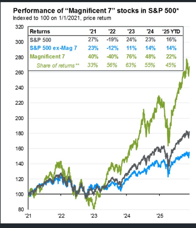 El gráfico muestra cómo las “Magnificent 7” han subido muchísimo más que el resto del S&P 500 desde 2021, haciendo casi el triple que el índice sin ellas.