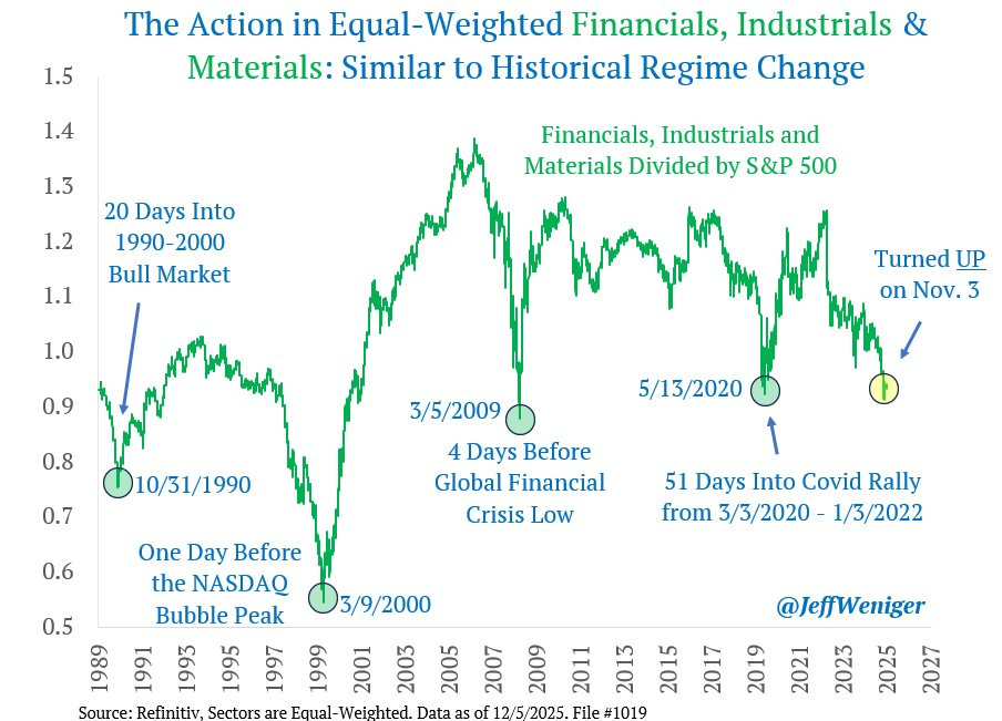Cada giro al alza anterior (1990, 2000, 2009, 2020) coincidió con cambios de ciclo importantes del mercado, y la línea volvió a girar al alza el 3 de noviembre de 2025, insinuando un posible nuevo “régimen” donde los cíclicos vuelvan a liderar.