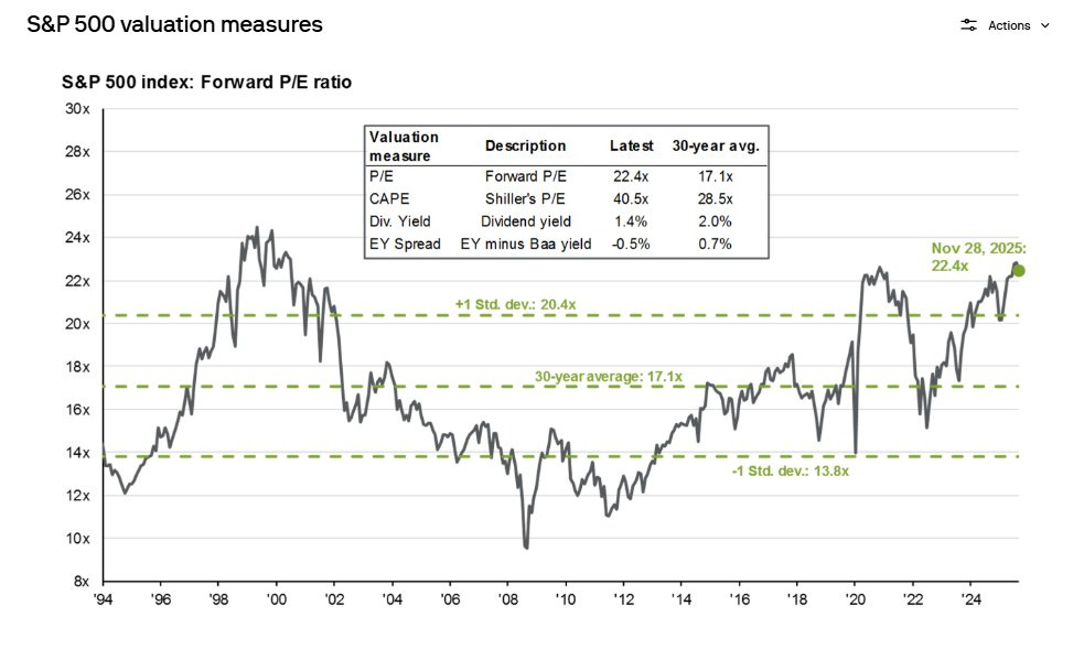 Actualmente el índice cotiza a unas 22,4 veces beneficios adelantados, claramente por encima de su promedio histórico, lo que indica una valoración exigente.