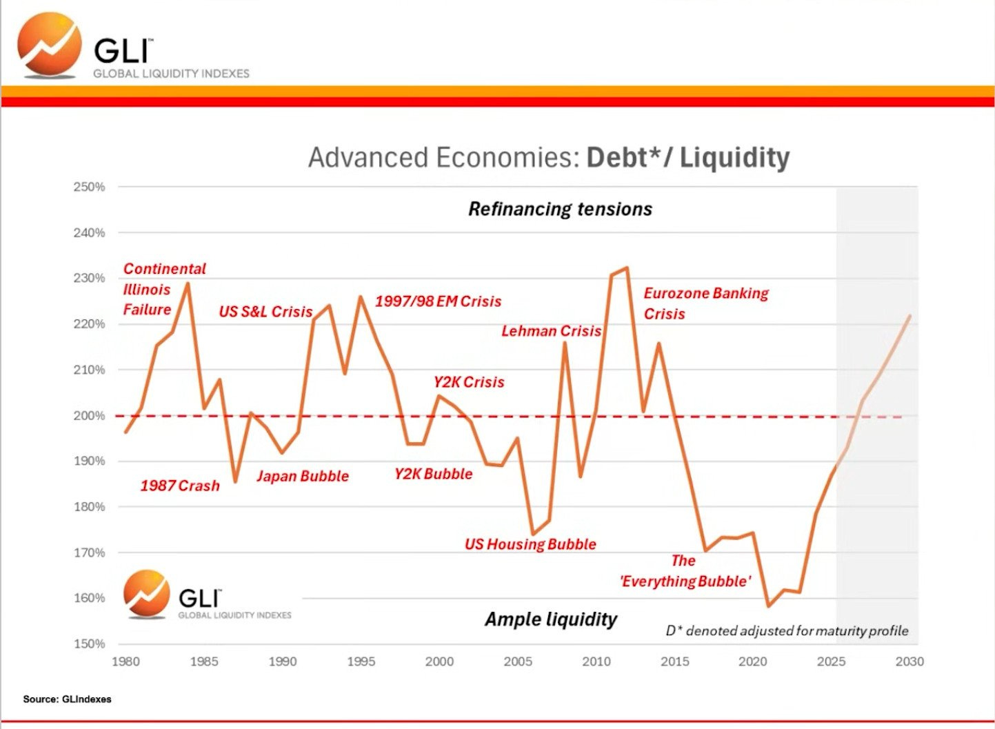 El gráfico muestra la relación deuda/liquidez de las economías avanzadas desde 1980, señalando que cuando este ratio supera aproximadamente el 200 % suelen aparecer tensiones de refinanciación y crisis (Crash del 87, burbuja japonesa, Lehman, crisis bancaria eurozona, etc.).