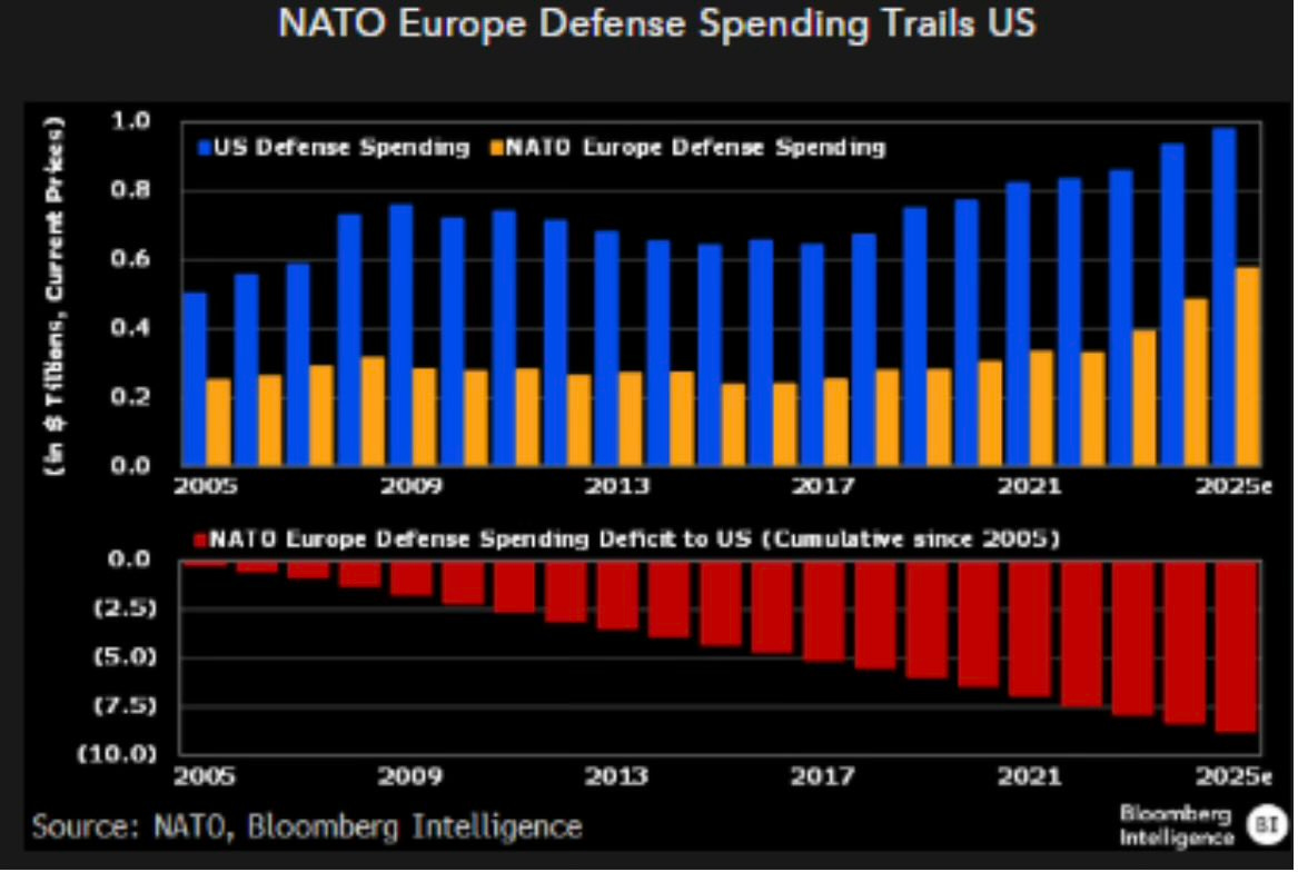 Desde 2005 el gasto en defensa de EE. UU. es muy superior al de Europa de la OTAN, aunque ambos han ido aumentando y se espera que sigan subiendo hasta 2025.