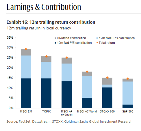 En casi todas las regiones, especialmente en S&P 500 y Stoxx 600, una parte relevante del retorno procede de la expansión de múltiplos (P/E), más que de dividendos o crecimiento del BPA.