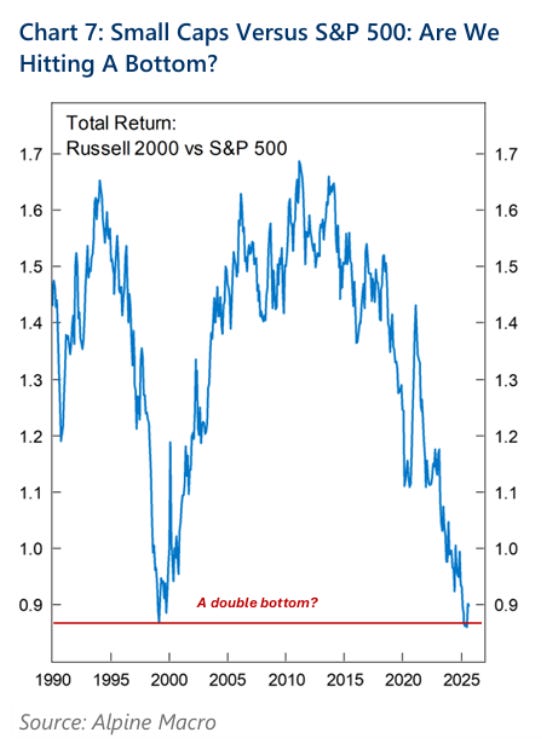 Estamos cerca del mismo suelo que a comienzos de los 2000, lo que sugiere un posible “doble suelo” y, potencialmente, un punto de inflexión a favor de las small caps.