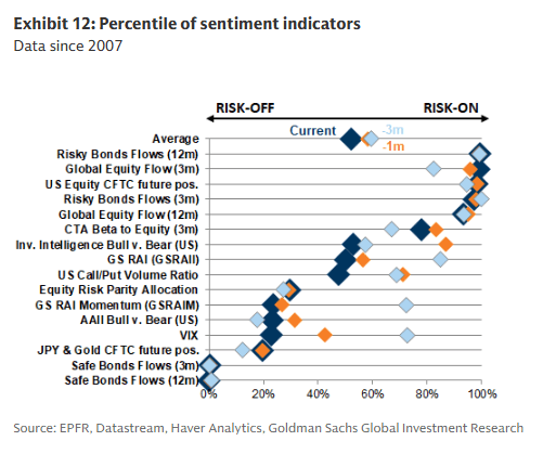 El gráfico muestra que la mayoría de indicadores de sentimiento (flujos a renta variable y bonos de riesgo, posicionamiento, encuestas) están hoy en percentiles muy altos, es decir, en claro modo risk-on frente al histórico desde 2007.