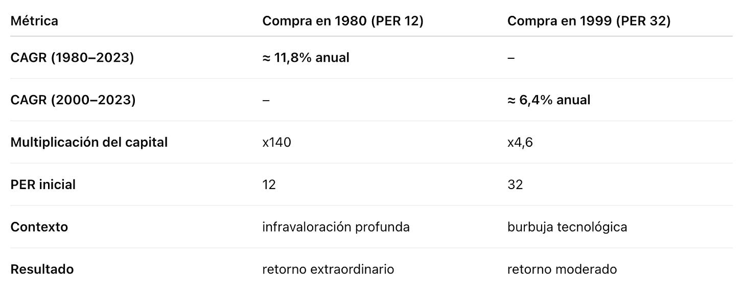 Puede parecer poco pero quienes compraron en 1980 multiplicaron su capital por 140x, mientras que los de 1999 por 4.6x. Este patrón ha sido consistente históricamente y es una de las bases del enfoque de inversión Value.