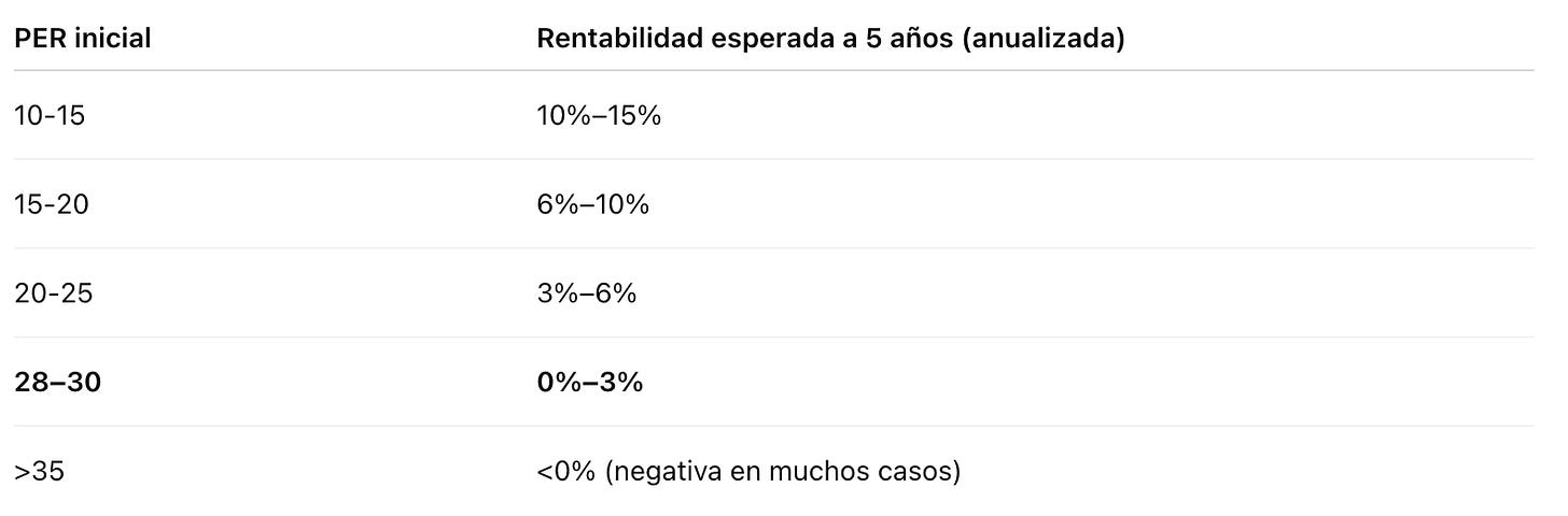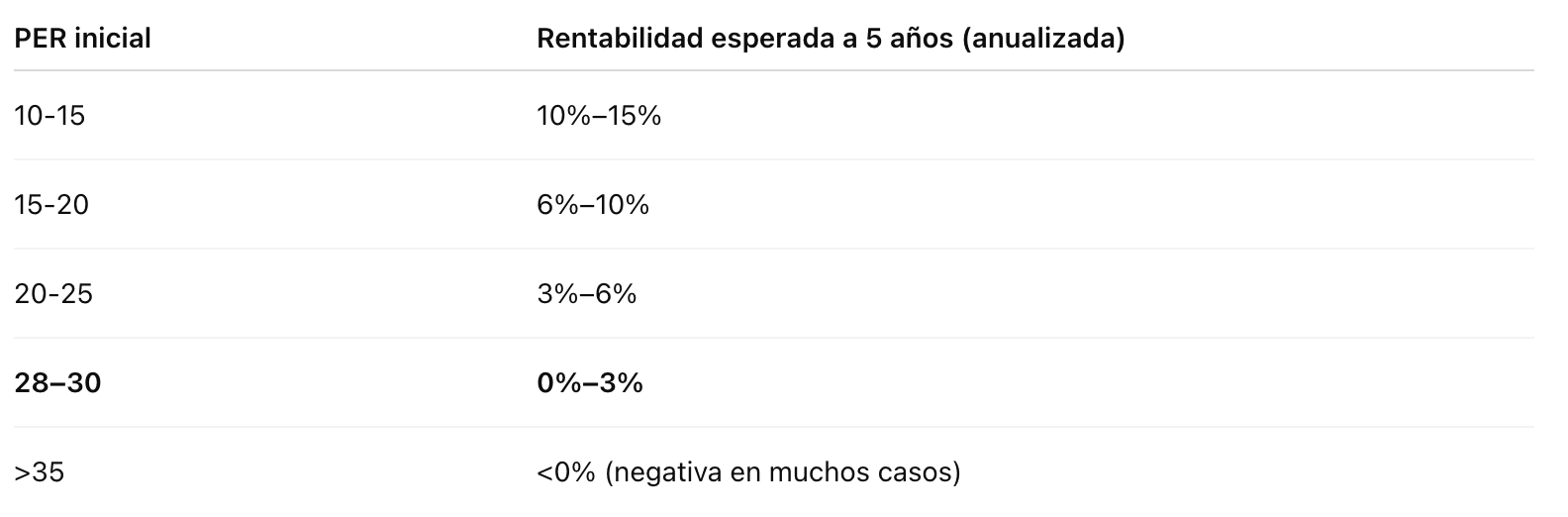 Según estudios de múltiples fuentes (Shiller, Hussman, GMO, Research Affiliates), cuando el PER está en torno a 28–30, las rentabilidades anuales medias posteriores a 5-10 años han sido modestas o negativas: