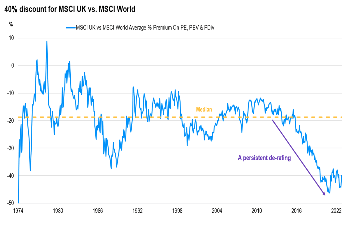 Esta baja valoración de las empresas de UK en comparación a otros indices ha llevado al MCSI de UK a cotizar con un 40% de descuento respecto a la media histórica de valoración del MCSI World: