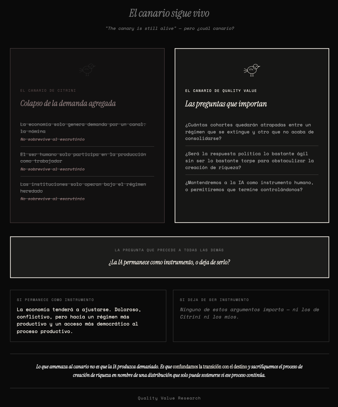 El canario que hay que vigilar no es el que Citrini describe. Su canario — el colapso de la demanda agregada por la sustitución del trabajo — presupone que la economía solo sabe generar demanda por un canal (la nómina), que el ser humano solo sabe participar en la producción de una forma (como trabajador), y que las instituciones solo saben operar bajo un régimen (el heredado). Ninguna de esas tres premisas sobrevive al escrutinio.