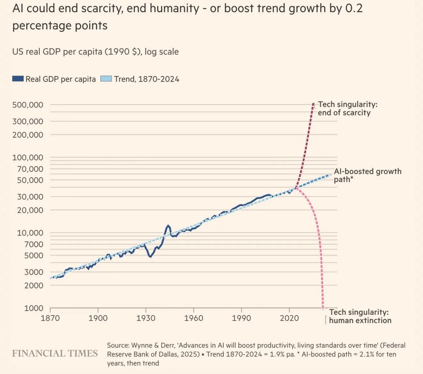 El Financial Times publicó hace meses un gráfico que ilustra esta dualidad con claridad: dos escenarios extremos —uno de estancamiento tecnológico y otro de superinteligencia descontrolada— flanquean un escenario central de integración gradual y relativamente ordenada. El abanico real de posibilidades es incomparablemente más ancho que el de cualquier innovación previa.