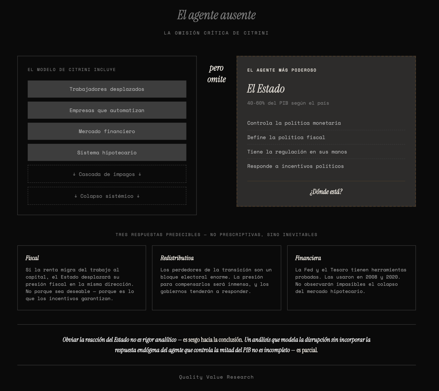 Y la omisión no es menor, porque la respuesta estatal no es una variable exógena que pueda incluirse o no a voluntad del analista; es una consecuencia endógena de los mismos incentivos que Citrini describe. Cuando millones de votantes pierden su empleo y el sistema financiero entra en estrés, los gobiernos no se quedan mirando.