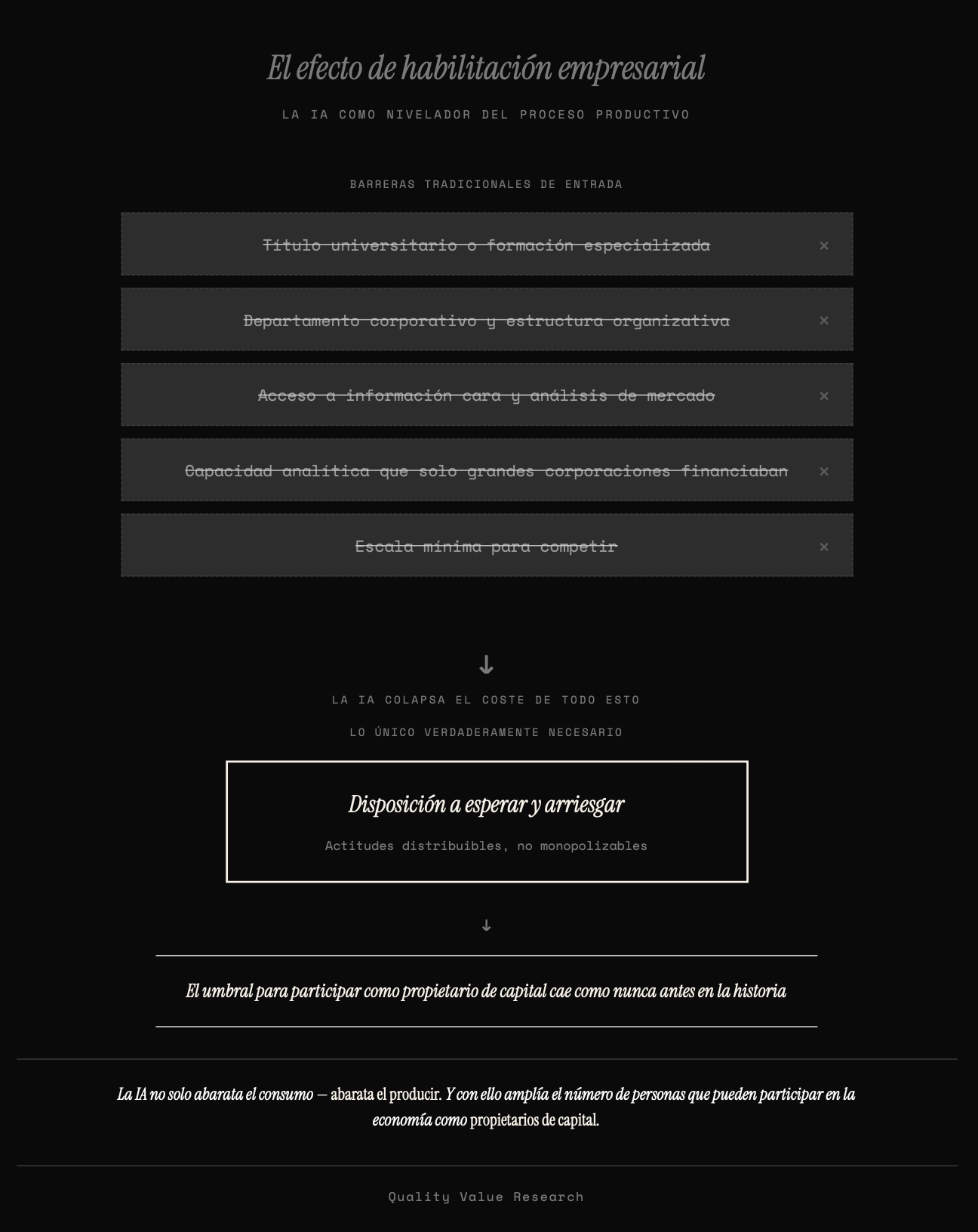 Es lo que podríamos llamar el efecto de habilitación empresarial de la IA: no solo abarata el consumo, sino que abarata el producir — y con ello amplía el número de personas que pueden participar en la economía como propietarios de capital.