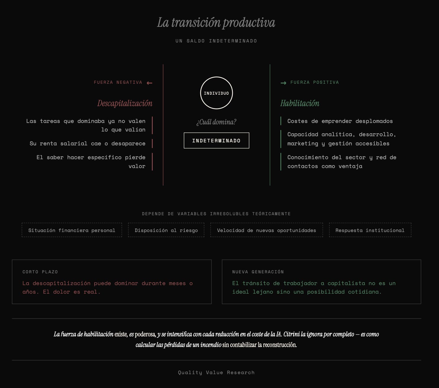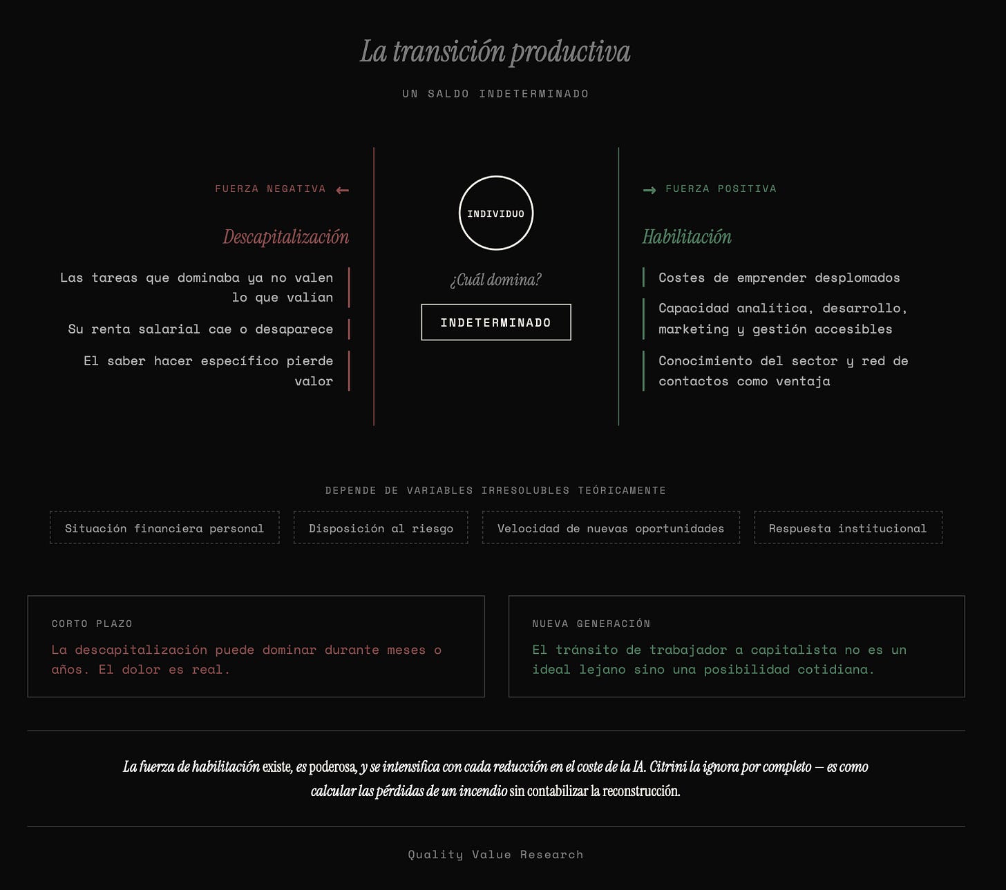 Nada de esto invalida el ejercicio de Citrini como escenario. Lo que invalida es su pretensión implícita de descripción probable. Lo que podemos hacer — y es lo que intentará este artículo — es identificar los mecanismos económicos que probablemente operarán en la transición (la competencia, el abaratamiento, la democratización del acceso al capital) y los errores teóricos que impiden a Citrini verlos, sin pretender que sabemos cuándo, a qué velocidad ni con qué forma concreta se materializarán.