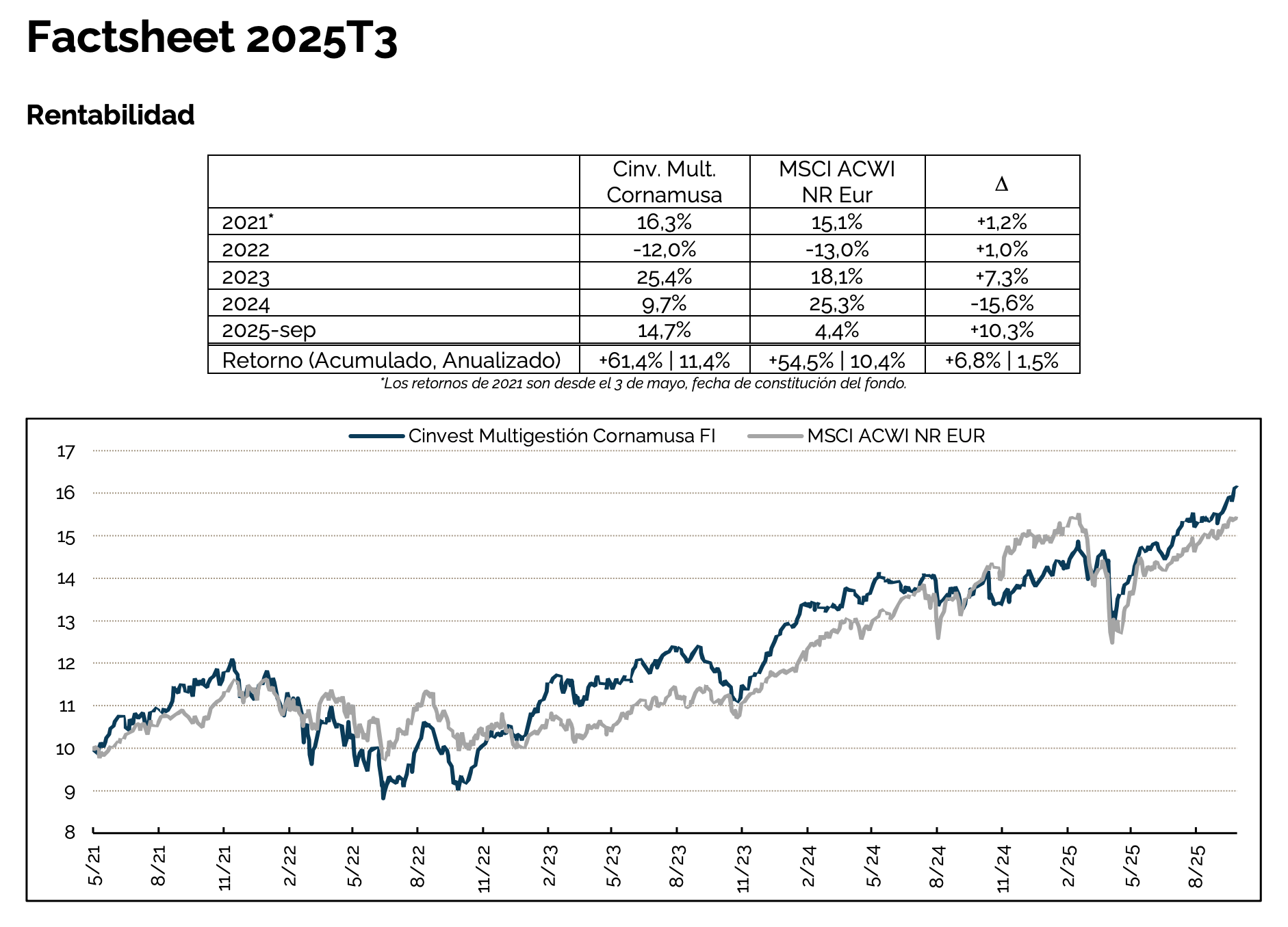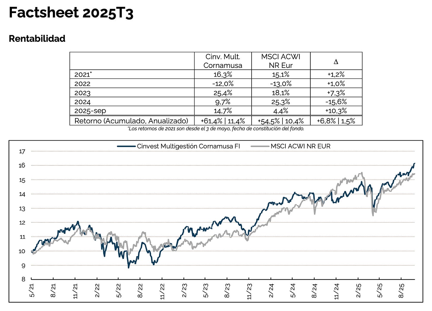 Pese al letargo reciente de las small caps europeas, Cornamusa ha logrado una rentabilidad media anual del 11,4%, superando al MSCI World en alrededor de 1 punto a fecha de hoy.