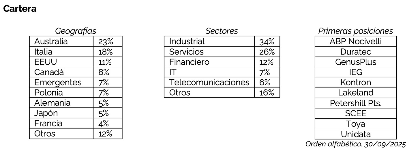 La cartera está sesgada a small caps de Australia e Italia, con peso en industrial y servicios. En la última carta trimestral podemos ver las principales posiciones: