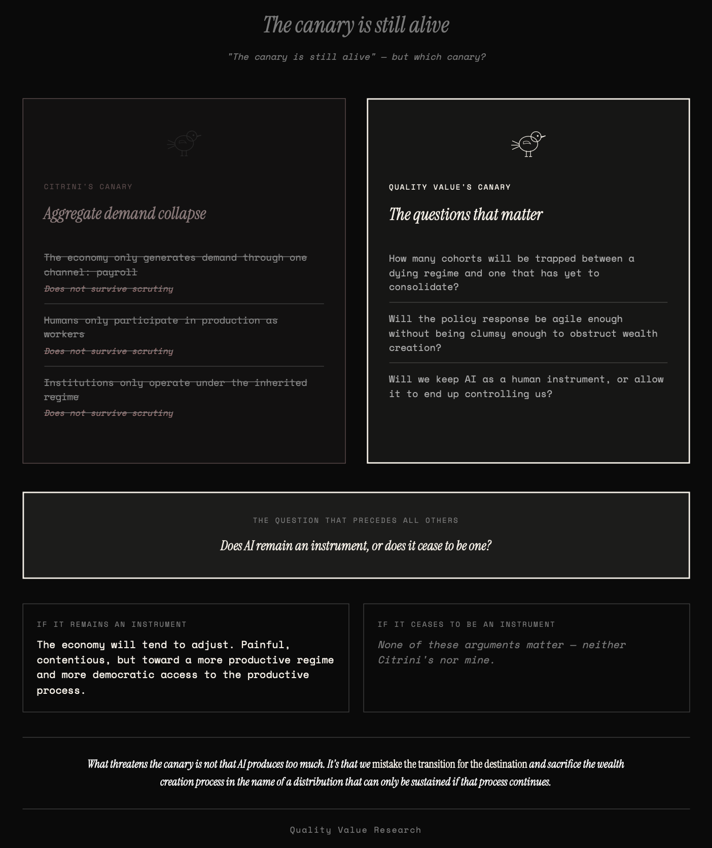 The canary to watch is not the one Citrini describes. His canary—the collapse of aggregate demand through labor substitution—presupposes that the economy only knows how to generate demand through one channel (the payroll), that human beings only know how to participate in production in one form (as workers), and that institutions only know how to operate under one regime (the inherited one). None of those three premises survives scrutiny.
