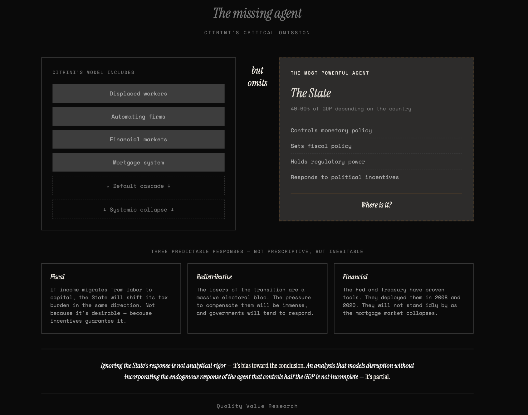 And the omission is not minor, because the state’s response is not an exogenous variable that can be included or not at the analyst’s discretion; it is an endogenous consequence of the same incentives that Citrini describes. When millions of voters lose their jobs and the financial system comes under stress, governments do not stand by watching.