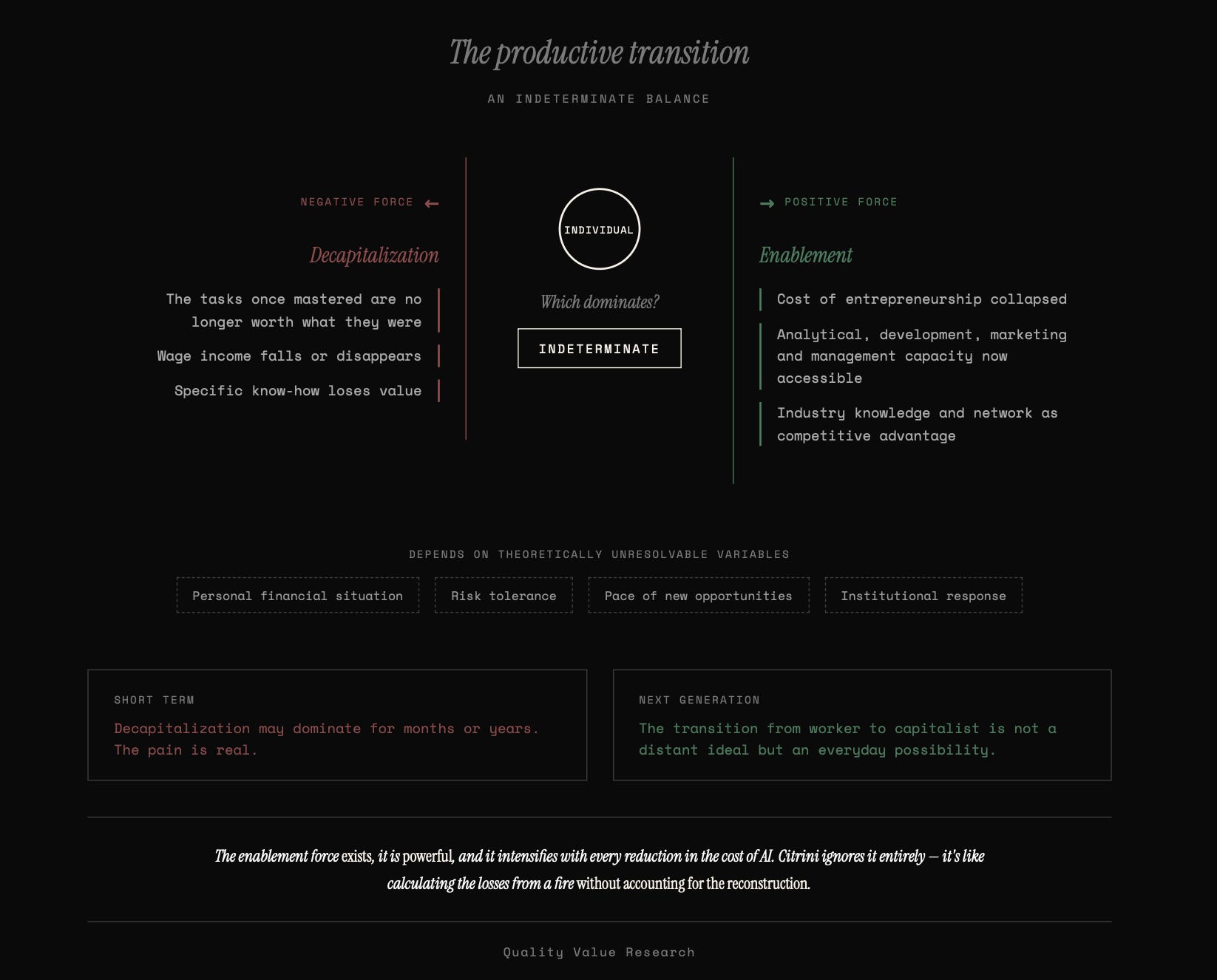 The net balance of these two forces—decapitalization of specific work and enablement of entrepreneurial capital—will determine the real experience of the transition for each individual, each cohort, and each region. It is not a balance that can be resolved a priori either in Citrini’s catastrophist direction or in the optimist one.