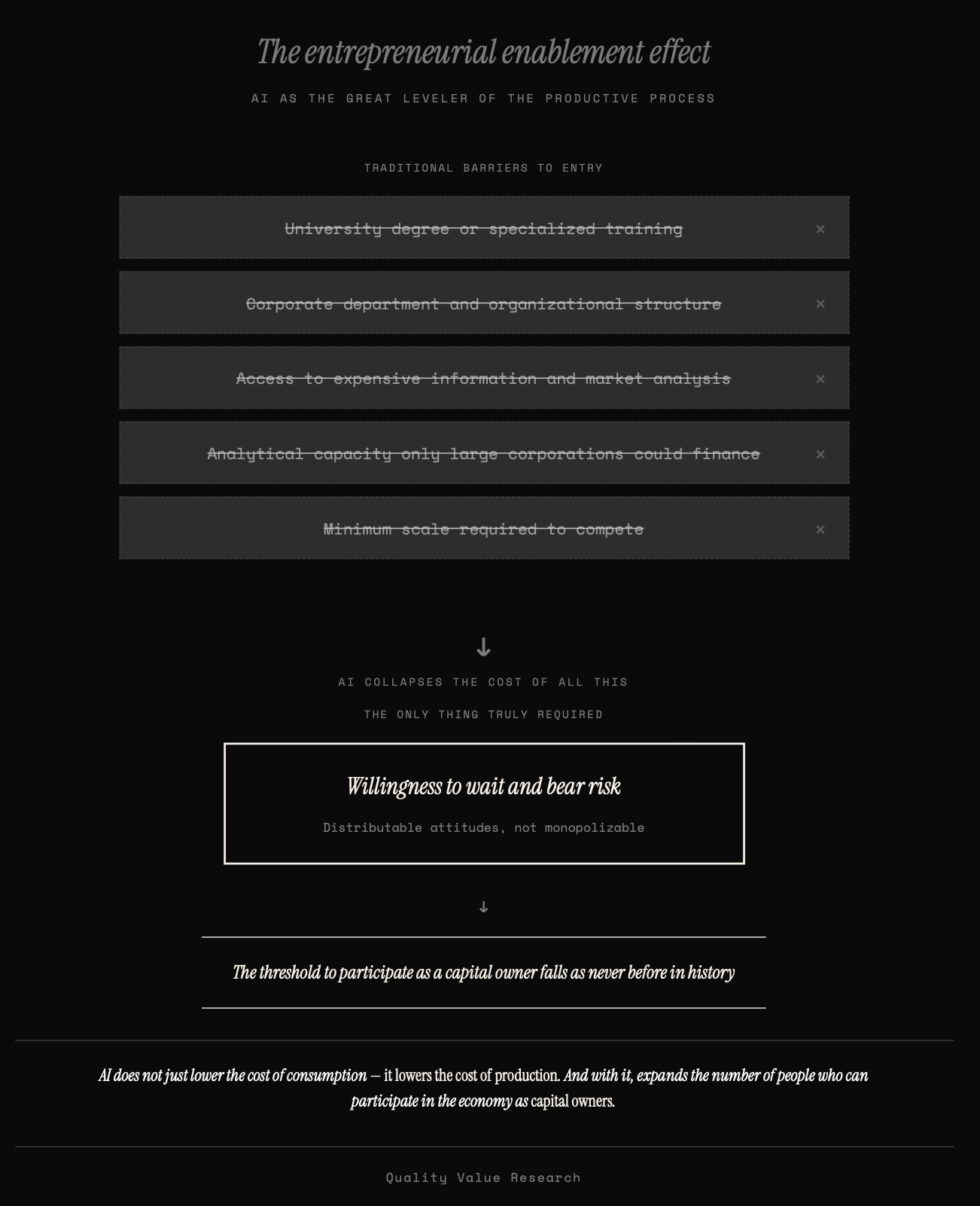 This is what we might call the entrepreneurial enablement effect of AI: it not only cheapens consumption but cheapens production—and with it expands the number of people who can participate in the economy as owners of capital.