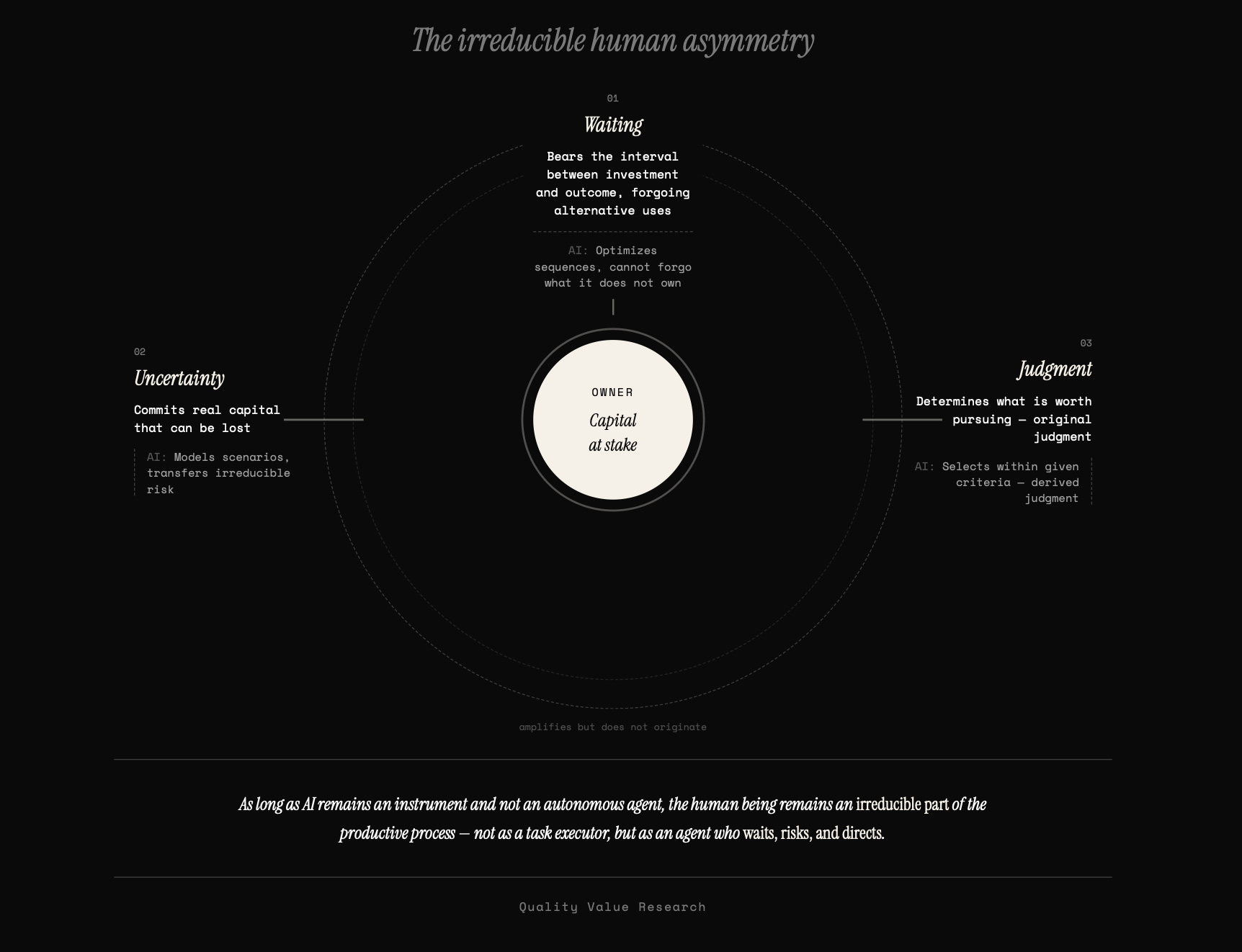 The first is waiting: every productive process requires that someone financially sustain the interval between the initial investment and the final result, renouncing the alternative uses of those resources during that period. AI can optimize the sequence of a project, but it cannot be the one who renounces the alternative uses of a capital it does not possess. The waiting falls on whoever owns the resources, and that someone is, in a human economy, a human being.