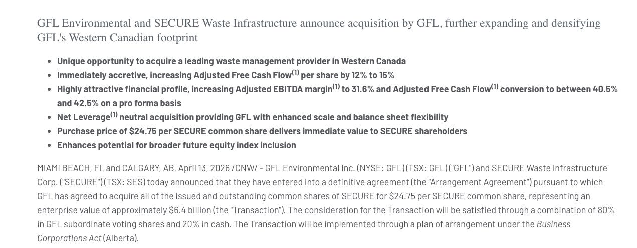 El 13 de abril, GFL anunció la adquisición de Secure a C$24,75 por acción, en un deal valorado en C$6.400 millones, estructurado 80% en acciones de GFL y 20% en efectivo.